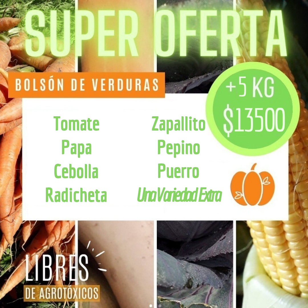 VERDURAS -MÁS DE 5 KG- El bolsón se arma con la cosecha del día. En el caso de no poder cosechar alguno de los items indicados se reemplazará con otro item. Es posible, que en caso de escases en la cosecha se reemplace algún item con otro que ya figura en el bolsón. En lo posible intentamos mantener siempre la variedad. Tomate Papa Radicheta Pepino Zapallito Puerro Cebolla ❓Una Variedad Extra (dependiendo de la cosecha del día)