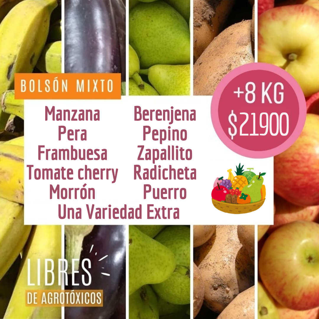 MIXTO -MÁS DE 8 KG-El bolsón se arma con la cosecha del día. En el caso de no poder cosechar alguno de los items indicados se reemplazará con otro item. Es posible, que en caso de escases en la cosecha se reemplace algún item con otro que ya figura en el bolsón. En lo posible intentamos mantener siempre la variedad. Frambuesa Manzana Pera Tomate cherry Berenjena Morrón Pepino Puerro Zapallito Radicheta ❓Una Variedad Extra (dependiendo de la cosecha del día)